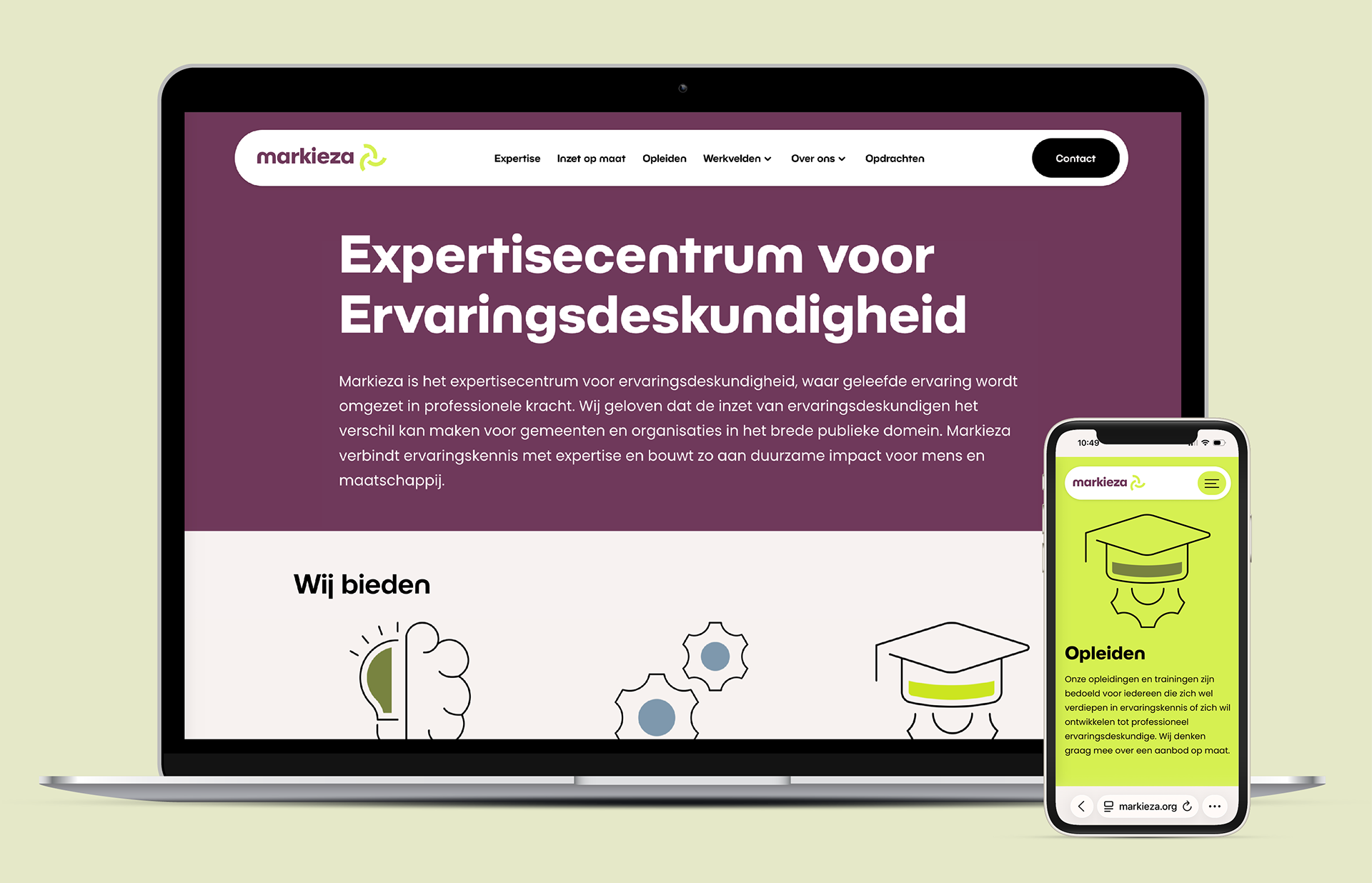 Markieza kreeg een nieuw beeldmerk: een abstracte vorm die groei, beweging en transformatie verbeeldt. De twee kleuren die al jaren bij Markieza horen, hebben we bewust behouden. Ze zorgen voor herkenning en vertrouwdheid. De bordeauxpaarse kleur voelt warm en koel tegelijk. Het frisse limegroen straalt lef, energie en creativiteit uit. De kleuren zijn gebleven, de vorm is vernieuwd. En ook de typografie is meegegroeid: de letters kregen rondere en openere vormen. Het resultaat is een eigentijds logo. Herkenbaar. Professioneel én toegankelijk.
